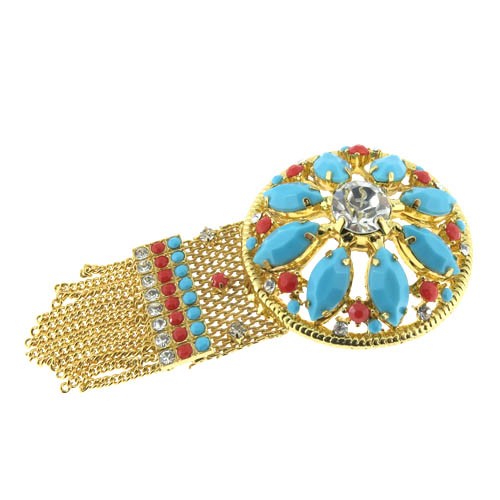 אלמנט שבטי פרח עגול, משובץ בקריסטלים ואבני פלסטיק בגווני טורקיז וקורל, עשוי מפליז+מצופה בזהב מבריק