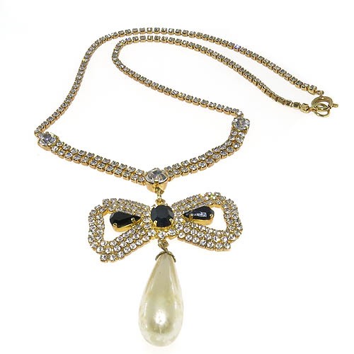 שרשרת שטרס משובצת בקריסטלים שקופים ושחורים, מצופה בזהב מבריק, מעוטרת בפפיון + גדיל פנינה 40 ס"מ